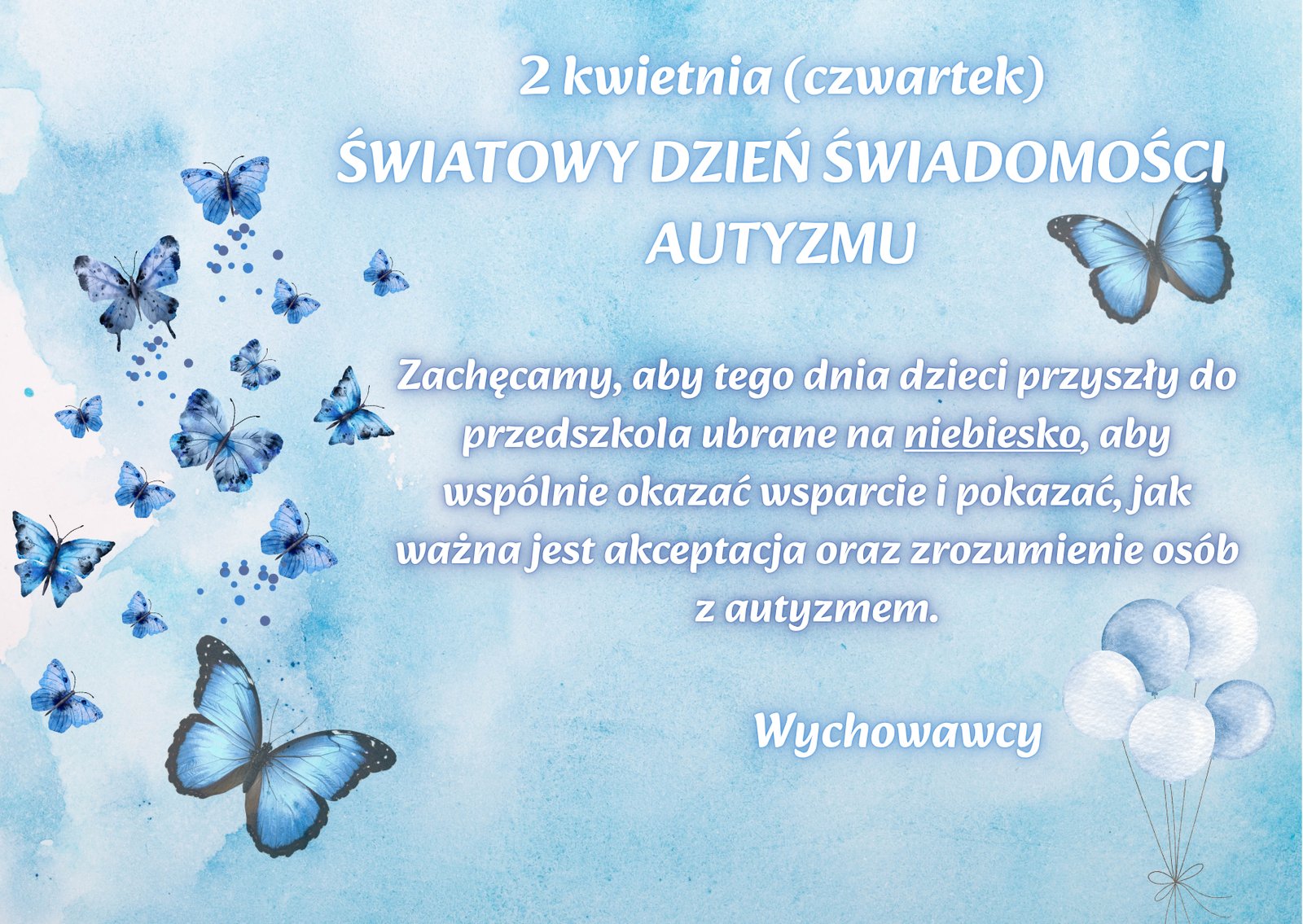 Zachęcamy, aby tego dnia dzieci przyszły do przedszkola ubrane na niebiesko, aby
