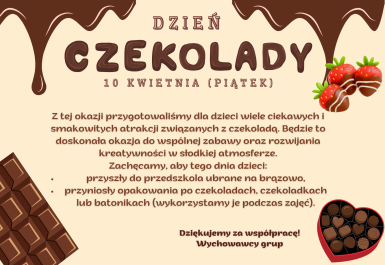 Zachęcamy, aby tego dnia dzieci: przyszły do przedszkola ubrane na brązowo,. przyniosły opakowania po czekoladach, czekoladkach lub batonikach (wykorzystamy je podczas zajęć).