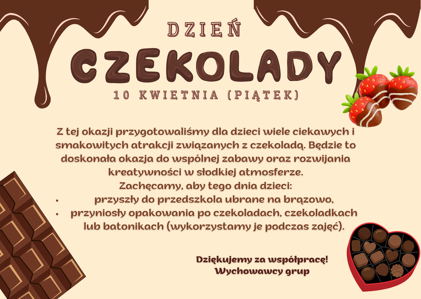 Z tej okazji przygotowaliśmy dla dzieci wiele ciekawych i smakowitych atrakcji związanych z czekoladą. Będzie to doskonała okazja do wspólnej zabawy oraz rozwijania kreatywności w słodkiej atmosferze.